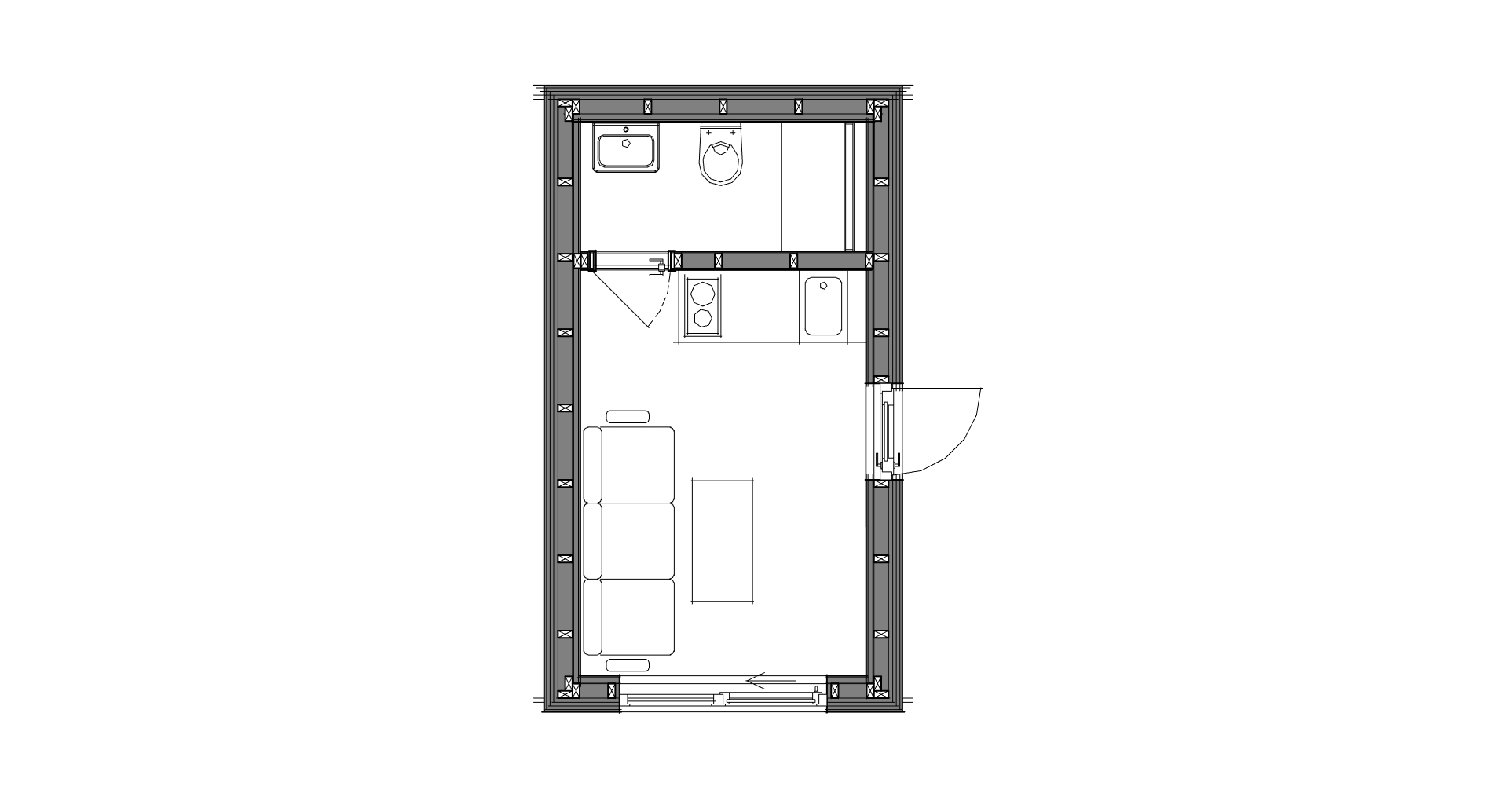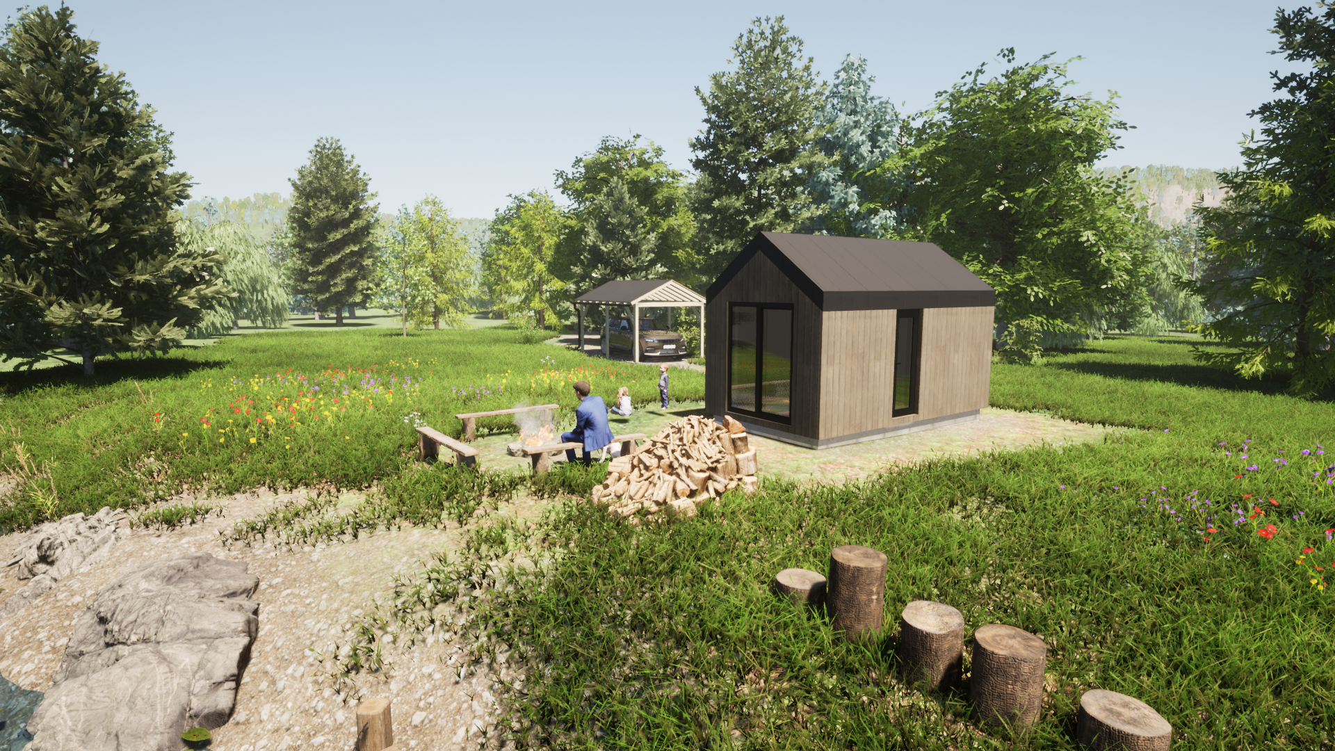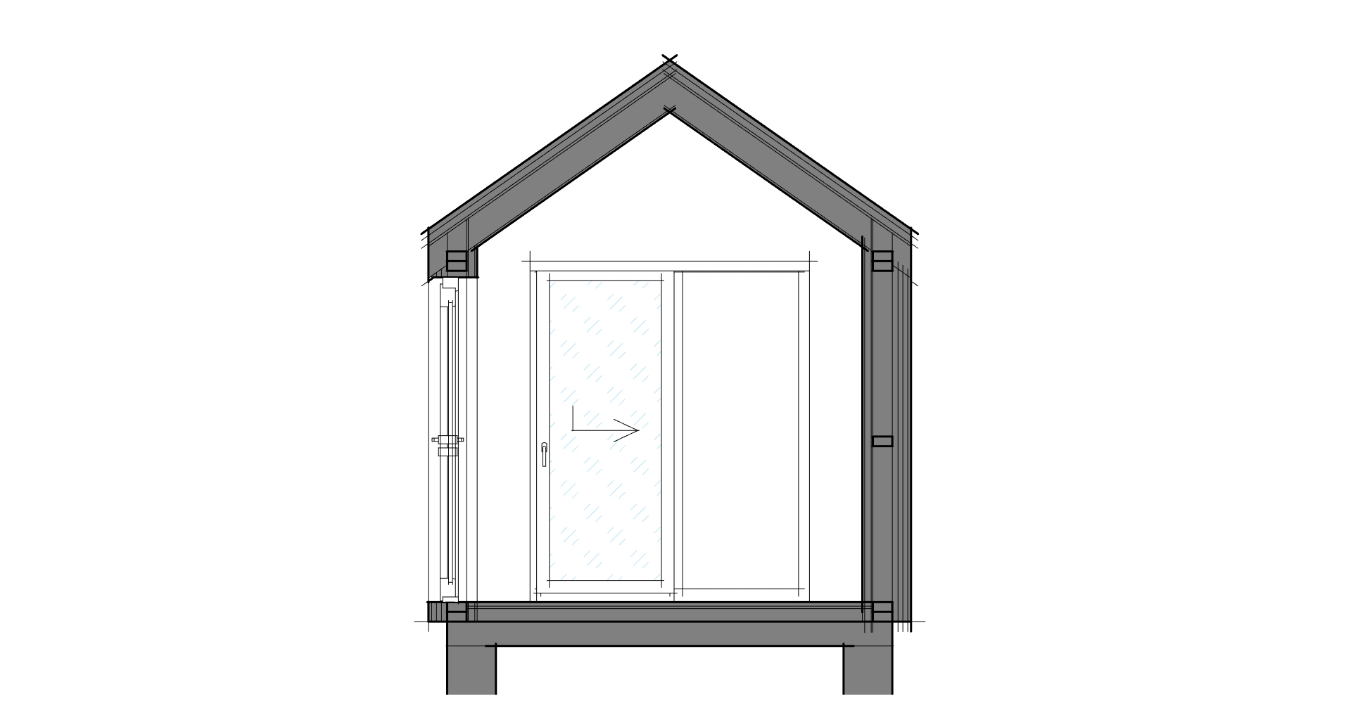 Nosná konstrukce mini chaty se sedlovou střechou. Součástí je sloupková konstrukce obvodových stěn, konstrukce krovu a vnitřní dělící a ztužující příčka, včetně spojovacího materiálu.